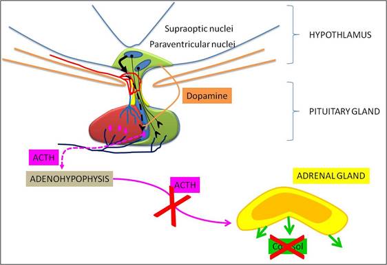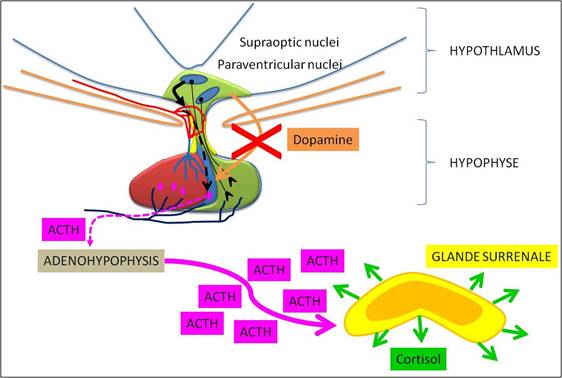 Chez les chevaux sains, l’hypothalamus sécrète de la dopamine (neurotransmetteur clé du cerveau) qui va avoir un effet de frein au niveau de la production et de la sécrétion de l’ACTH par l’hypophyse.