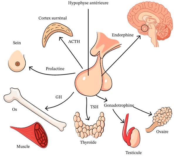 Voici un schéma montrant les principales hormones sécrétées par l’hypophyse et leurs principales cibles :